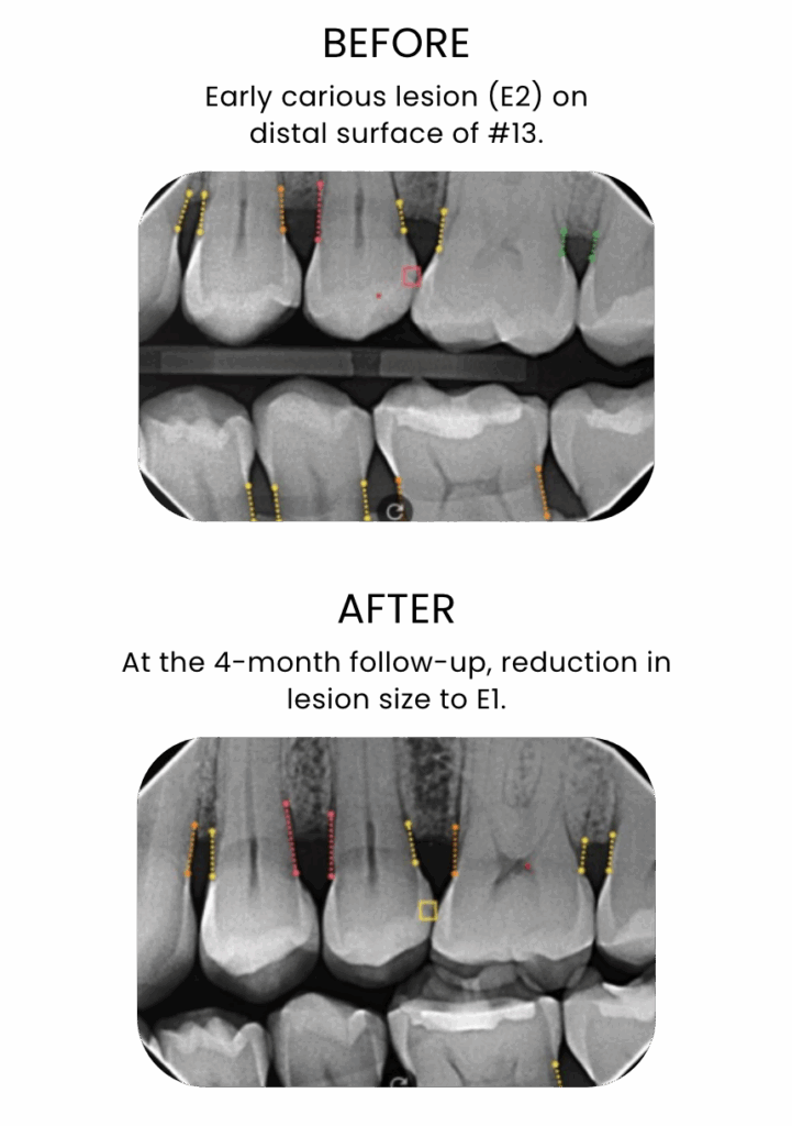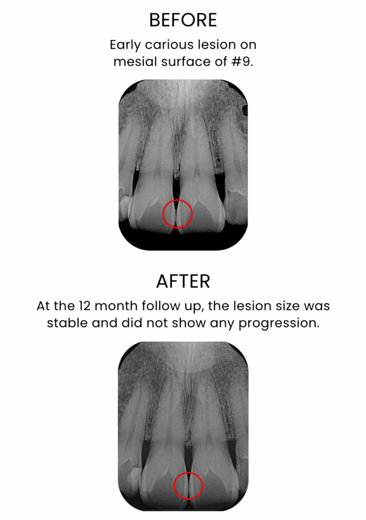 Success with CURODONTTM REPAIR FLUORIDE PLUS is the lack of progression of a treated early carious lesion. This can be seen either as stability in the lesion size or as the reduction in the size and depth of the lesion over time. The ‘whiteness’ of carious white spot lesions may reduce but might not completely regain the appearance of sound enamel. Thus, it is important to treat these lesions with CURODONTTM REPAIR FLUORIDE PLUS as early as possible to obtain the optimal desired outcome.
