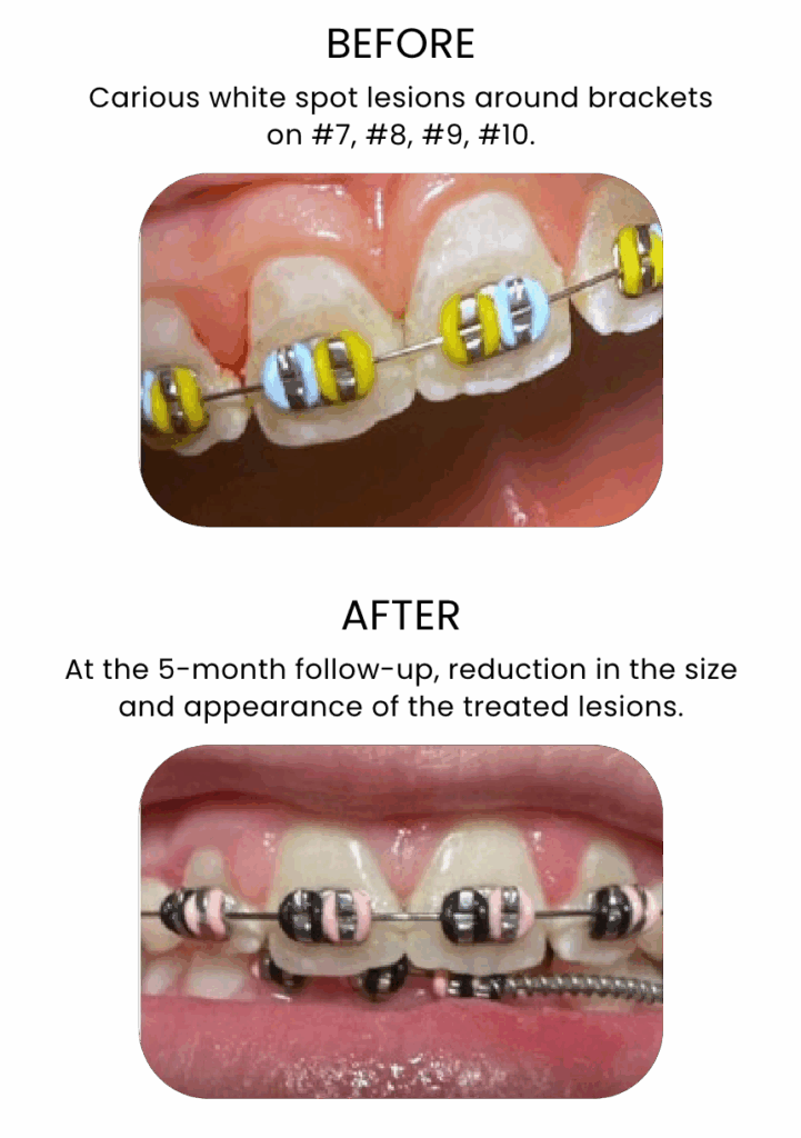 Yes, CURODONTTM REPAIR FLUORIDE PLUS can be used on early caries developing around bonded brackets. Patients undergoing fixed orthodontic treatment are at an increased risk of developing caries, due to difficulty in oral hygiene maintenance. Since the use of CURODONTTM REPAIR FLUORIDE PLUS does not require the placement of a rubber dam or any finishing and polishing procedures, it can easily be used around bonded brackets.